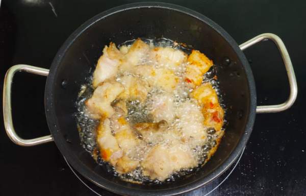 - Trộn bột chiên giòn phủ đều các miếng thịt
