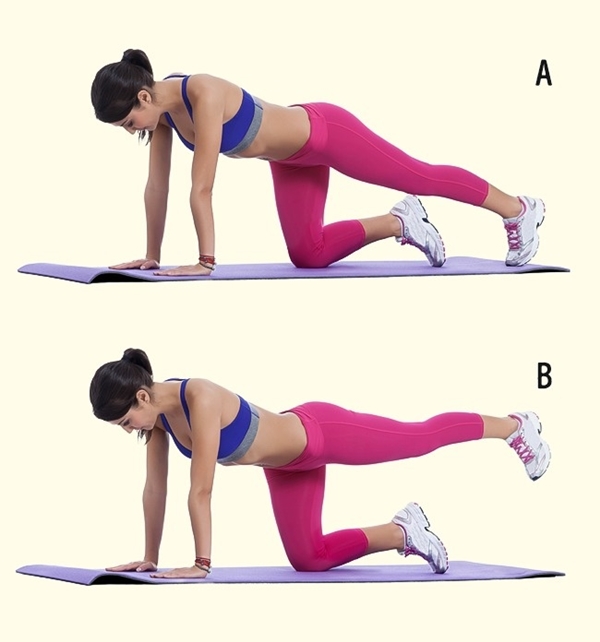 - Nằm sấp sao cho cơ thể được nâng đỡ bởi hai tay và gối phải, chân trái duỗi thẳng về phái sau. Bạn lưu ý, hai tay duỗi thẳng.