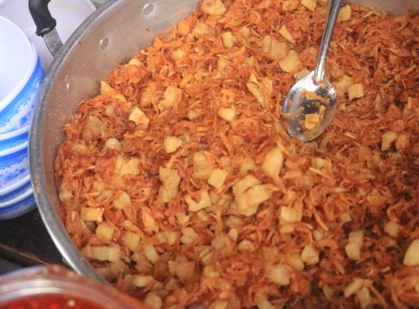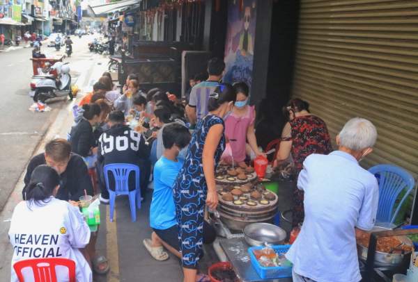 6 giờ hơn, khách kéo đến, hàng chục lượt người đông hơn so với cả tưởng tượng của tôi. Hàng ăn nhỏ, chừng 5 - 6 cái bàn, nên cứ 3 - 4 nhóm khách là kín chỗ. Khách thì liên tục gọi món, ông bà chủ cùng vài người thân trong nhà chia nhau mỗi người một việc, nhanh chóng mang ra những phần bánh vừa đổ nóng hôi hổi, nghi ngút khói.