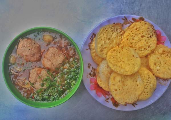 Trong lúc vợ đổ bánh, ông Thành chuẩn bị một chén xíu mại mang ra cho tôi, mùi thơm nức mũi. Trong cái chén nhỏ chừng 3 viên xíu mại là phần nước dùng vừa phải, mê nhất là hành tươi băm nhuyễn, tỏi phi, tóp mỡ và một chút ớt xay. Ông chủ nói “nhìn đơn giản vậy thôi chứ ăn ngon lắm đó con”.
