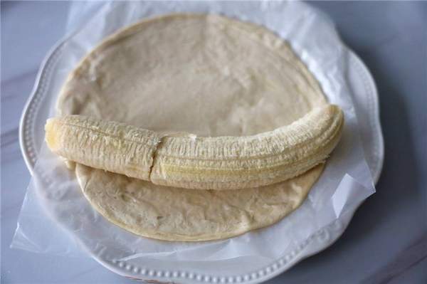 2. Bọc chuối vào vỏ bánh và cuộn lại.