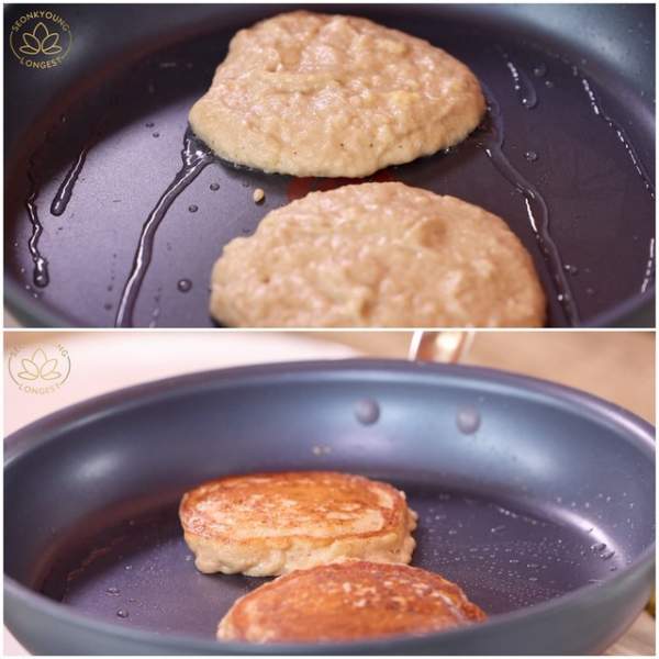 Đun nóng chảo trên lửa vừa, cho 2 thìa cà phê dầu dừa vào chảo và đun nóng, sau đó, múc (hoặc đổ) một lượng hỗn hợp bột vừa đủ vào chảo, rán đến khi 2 mặt đều có màu nâu giòn trong khoảng 3 – 4 phút.