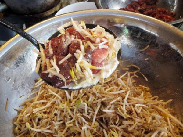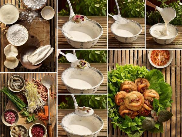 Bắt đầu chiên, người ta cho nhiều dầu vào chảo, ngập chiếc bánh và nổi lửa cho dầu sôi lên. Tiếp đến để giá sống, gan heo, tôm vào trong vá với số lượng tùy thích, rồi múc bột cho ngập các loại nguyên liệu này và nhúng vá vào trong chảo dầu một lát để cho bánh dính kết lại rồi từ từ rút vá không ra. Tránh để bột nhiều lần làm bánh bị dị tật không đẹp. Để tôm vào vá sau cùng trước khi múc bột, nên khi chín, hình con tôm nổi rõ trên mặt bánh trông thật đẹp mắt. Và cứ thế làm tiếp đến khi thấy trong chảo dầu đã chật bánh thì thôi. Đợi đến khi bánh chín vàng, tuần tự vớt bánh ra theo thứ tự trước sau và để trên vỉ tre hoặc vỉ kẽm gác ngang ở miệng chảo cho ráo dầu là bánh có thể ăn được.