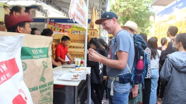 Du khách trải nghiệm ăn thử bánh mì tại một gian hàng trong lễ hội.