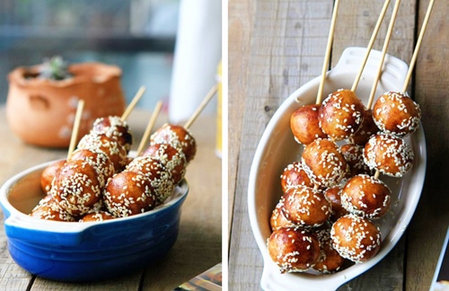 - Cứ chiên nhỏ lửa cho đến khi bánh có màu vàng nâu và vỏ giòn giòn là được. Gắp bánh ra, lăn đều vào bát vừng trắng rang sau đó xiên vào que là được.