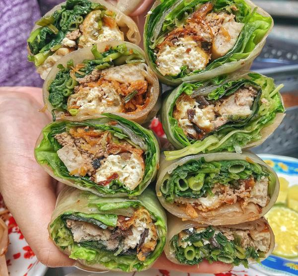 Món cuốn có đầy đủ các topping truyền thống như tôm khô, xoài, rau răm, bơ, trứng. Đặc biệt, nước chấm chua ngọt đi kèm chính là điểm nhấn cho món ăn độc lạ này.