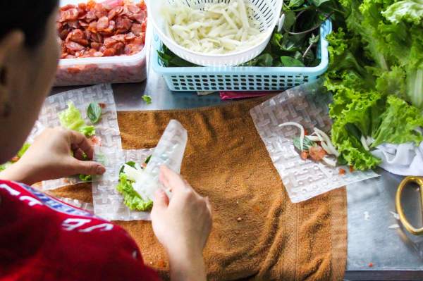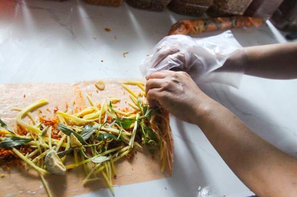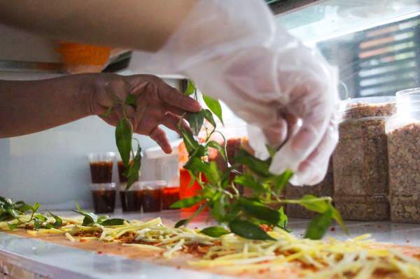 Đầu tiên, chị Tuyết làm ướt 4 miếng bánh tráng và ghép chúng lại với nhau. Tiếp đến chị rải các loại nhân như muối tôm, xoài chua, rau răm, trứng gà, hành phi...