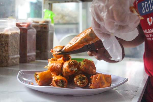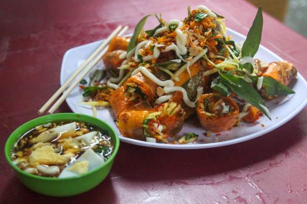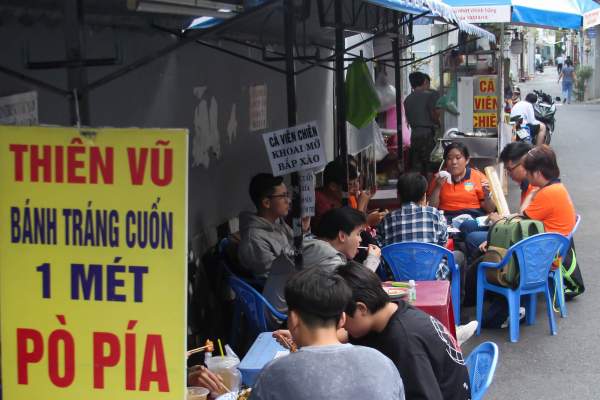 Quán bánh tráng cuốn nằm trong con hẻm nhỏ trên đường Trường Chinh (quận Tân Bình, TP. HCM) đã mở bán gần 10 năm. Thực đơn của quán ngày càng đa dạng với khoảng 20 món ăn vặt khác nhau. Đặc biệt, món được biết đến nhiều nhất là bánh tráng cuốn dài một mét với giá 25.000 đồng/phần.