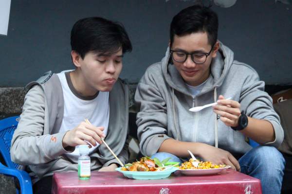Anh Trọng Nghĩa (24 tuổi, bên phải) là một trong những vị khách quen của quán. Anh thường tranh thủ thời gian sau giờ làm việc để cùng bạn bè đến đây. Phần bánh tráng “ngoại cỡ” luôn là sự lựa chọn hàng đầu của anh mỗi khi ghé ăn.