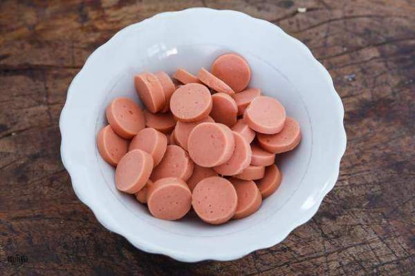 Xúc xích bóc vỏ, cắt thành các lát dày vừa phải.