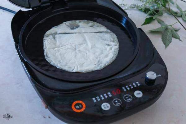 Làm nóng trước chảo nướng điện, chọn chức năng lửa trên và lửa dưới, cho 2 cái bánh tráng chập làm 1 vào khuôn, không phết dầu. Nếu không có chảo điện bạn có thể dùng chảo thường.