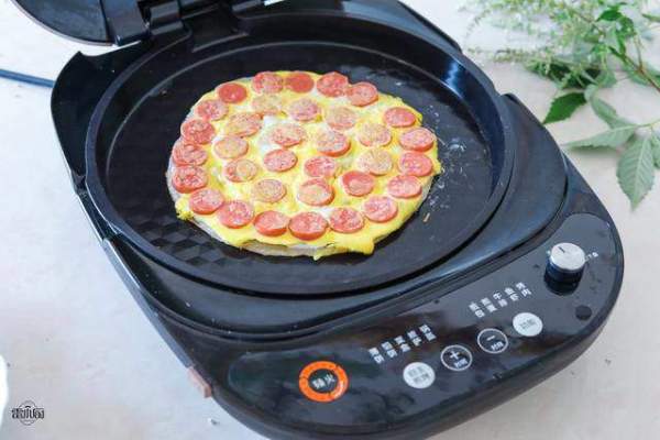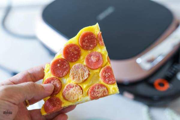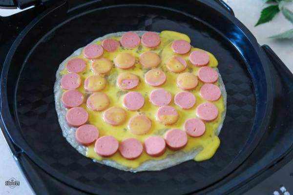 Sau đó xếp xúc xích đã cắt lên bánh tráng và đổ trứng đều lên. Nếu có hành lá cắt nhỏ, bạn cũng có thể rắc một ít hành lá cắt nhỏ lên trên để trang trí.