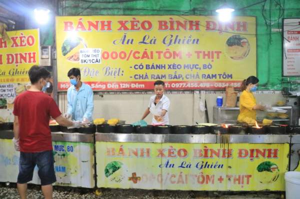 Bà Thủy cùng chồng điều phối hơn 30 bếp để đổ bánh xèo làm hết công suất, hơn chục nhân viên đổ bánh, lấy rau, nước chấm, tiếp khách liên tục để sớm mang món ra cho khách không phải chờ đợi lâu. Nhìn vào hàng chục khách ngồi kín bàn, bà chủ tâm sự quán thường đông khách vào buổi tối, nhất là những tối cuối tuần như vậy. Mỗi ngày quán bán hàng ngàn cái bánh xèo cho “đã cái nư” của bà chủ.