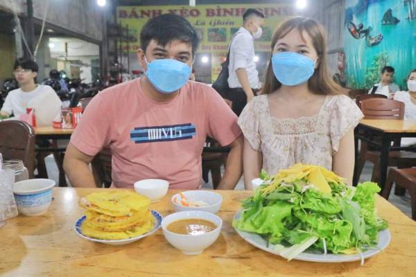 Tối đó, anh Nguyễn Thanh Bình dẫn chị Trần Thị Luyến (cùng 32 tuổi) từ Q.12 ghé quán bánh xèo của bà Thuỷ để ăn. Chị Luyến cho biết anh chị là khách ruột của quán từ năm 2017 đến giờ, từ lần đầu ăn đã mê luôn món bánh xèo ở đây nên ghé lại suốt nhiều năm qua.