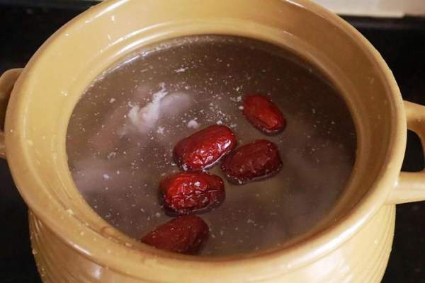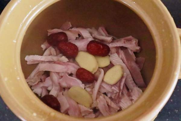 Bước 3: Cho bao tử heo vào nồi, thêm táo đỏ và gừng thái lát vào.