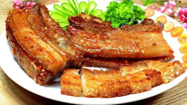 Đun sôi dầu ăn. Thoa nhẹ bột chiên giòn (hoặc bột bắp) bao áo thịt ba rọi rồi cho vào chiên cho tới khi thịt hơi se lại thì vớt ra rổ cho nguội. Sau đó, tiếp tục cho thịt vào chiên lửa 2, tăng lửa để da giòn, thịt sém vàng thì vớt ra.