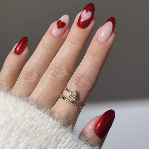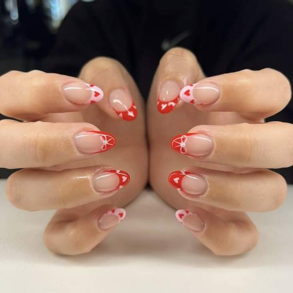 French tip vốn đã rất được yêu thích vì sự thanh lịch và tinh tế, nhưng trong mùa Valentine năm nay, kiểu sơn này được biến tấu với màu đỏ và hồng phấn nhẹ nhàng. Đặc biệt, những hình trái tim nhỏ xinh ở đầu móng tạo nên vẻ dễ thương và ngọt ngào, như mối tình đầu trong sáng.