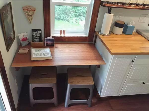 Nội thất bên trong được thiết kế tận dụng tối đa chiều cao của ngôi nhà. Những giá treo tường, những kệ mở là sự lựa chọn tuyệt vời để đặt ly, tách, những cuốn sách, thậm chí là chiếc lò vi sóng. Vật dụng trong nhà đơn giản, không quá nhiều, không cầu kỳ nhưng lại vô cùng tiện nghi, thỏa mãn những nhu cầu sinh hoạt cơ bản hàng ngày trong gia đình. Điều bạn có thể nhận thấy ngay chính là ngôi nhà được trang bị rất nhiều ô cửa sổ từ lớn đến nhỏ để tối đa hóa ánh sáng tự nhiên, khiến căn nhà trông sáng sủa và rộng rãi hơn.