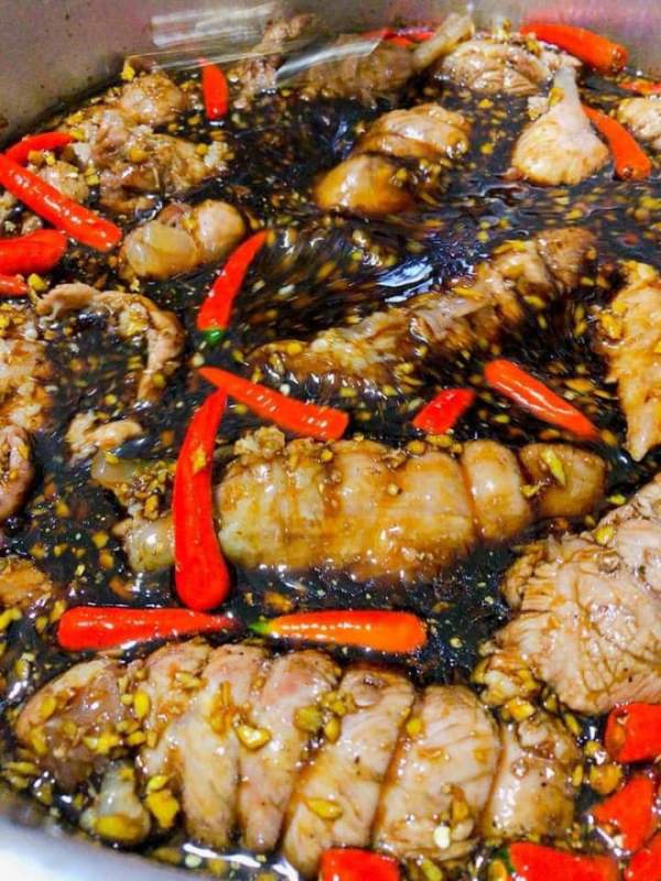 Và không như thông lệ thường làm bò ngâm mắm, chị Nguyệt lại làm món "Bò ngâm xì dầu". Theo chị Nguyệt thì món này siêu ngon, thử là chỉ có mê. "Mê mệt hơn là khi ăn kèm kim chi hoặc dưa cải, chế tô mì tôm nóng kèm thịt bò ngâm và rau sống.", chị Nguyệt mô tả.