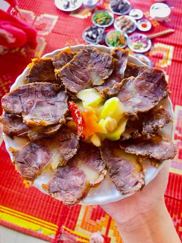 Thành phẩm Bò ngâm xì dầu, ăn kèm dưa muối, kim chi thì siêu ngon
