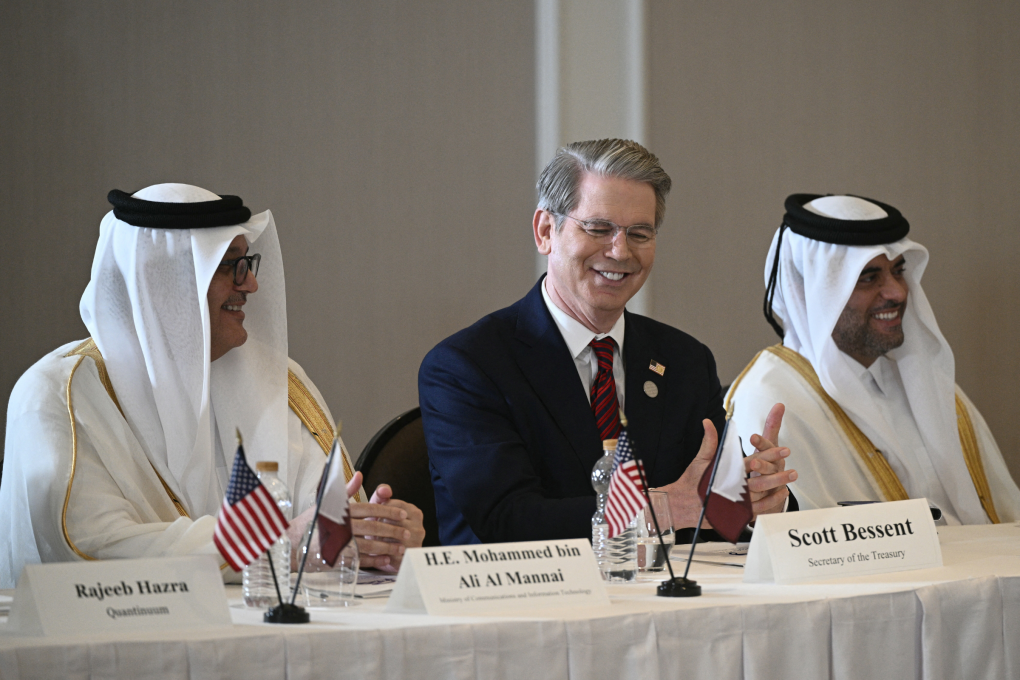 Bộ trưởng Tài chính Mỹ Scott Bessent (giữa) dự họp với các quan chức Qatar ở Doha, ngày 15/5. Ảnh: AFP
