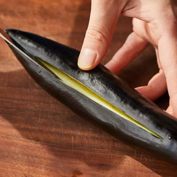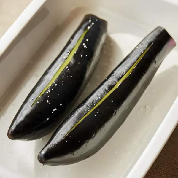 Bước 1: Cắt bỏ phần ngọn của cà tím, tạo một đường rạch dài ở giữa, sau đó cho vào khay nướng và rắc một chút muối lên trên.
