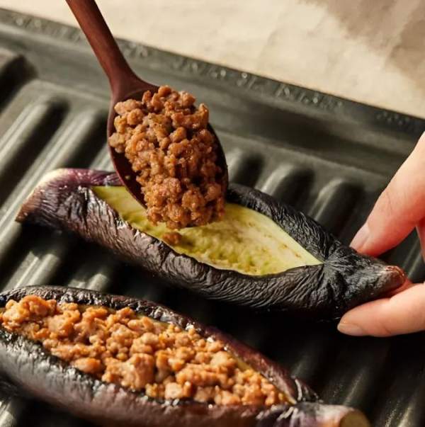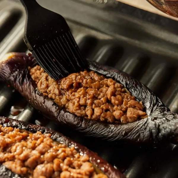 Bước 4: Cho đầy nhân thịt lợn vào cà tím, sau đó đặt lên khay nướng và phết nước sốt đều lên trên bề mặt.