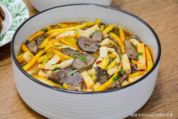 Gan heo làm sạch, cắt miếng nhỏ, cho vào bát với đậu phụ, cà rốt thái nhỏ, đậu phụ cắt miếng nhỏ, cùng nước lẩu chua cay. Đậy lại bằng màng bọc thực phẩm chuyên dùng rồi cho vào lò vi sóng, bật chế độ nóng nhất, nấu trong 6 phút.