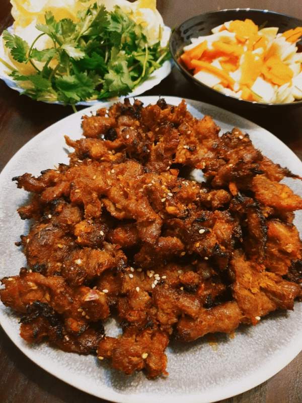 Không thể không nhắc đến những miếng thịt được ướp gia vị vàng ươm, nướng trên than hồng thơm nức mũi. Thịt sau khi chín không bị khô mà vẫn còn một lớp sốt sền sệt áo bên ngoài, cảm giác như gia vị ngấm vào từng thớ thịt, chỉ cần nhìn màu sắc cũng biết được chất lượng bên trong.