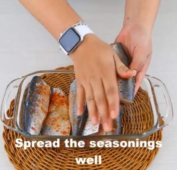 Tiếp đó, bạn xoa đều gia vị lên khắp mình cá.