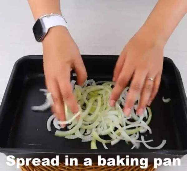 ... rồi rải đều hành xuống dưới đáy khay nướng như hình hướng dẫn, hoặc khay giấy bạc nếu dùng nồi chiên không dầu