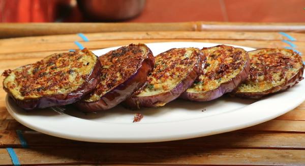 Cà tím rửa sạch, bỏ cuỗng và cắt khoanh tròn dày khoảng 2 cm rồi ngâm vào nước muối loãng.
