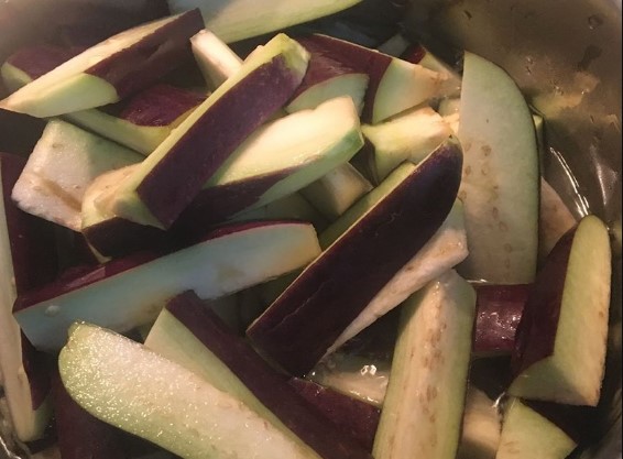 - Cho lượng dầu ăn xâm xấp miếng cà vào chảo, cho các miếng cà tím vào chiên cho đến khi bề mặt hơi vàng thì vớt ra để ráo dầu.