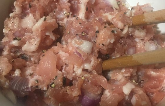 - Với thịt heo xay, bạn cho chút muối, thêm 1 thìa rượu nấu và 1 thìa tinh bột bắp vào trộn đều, ướp 10 phút.