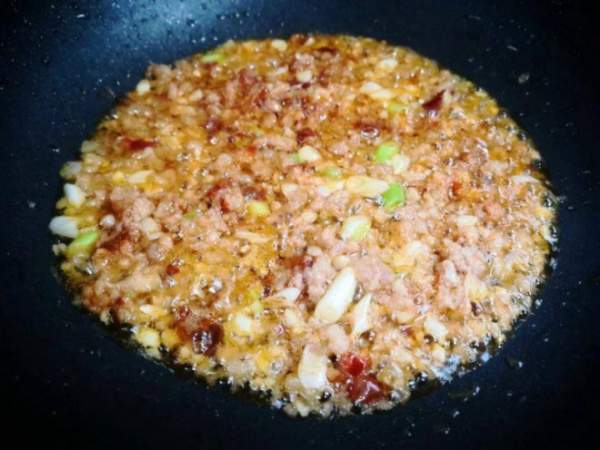 - Vẫn dùng chảo đó, đổ thịt băm vào dầu ăn vừa chiên cà và xào nhanh tay cho thịt săn lại. Cho đầu trắng hành lá, gừng, tỏi vào xào thơm.