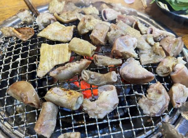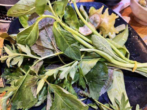 Lòng bò nướng cũng ăn kèm rau rừng. Thực khách gắp miếng lòng, kẹp vài cọng rau dớn, đọt cóc non vị chua chua, chát chát chấm với chao là chuẩn.