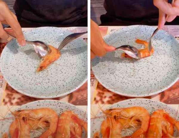 Bóc vỏ tôm bằng muỗng và đũa. Ảnh Internet.