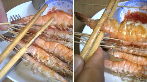 Với các món xiên nướng thì dùng đũa để bóc vỏ tôm.