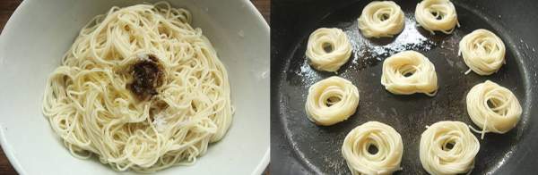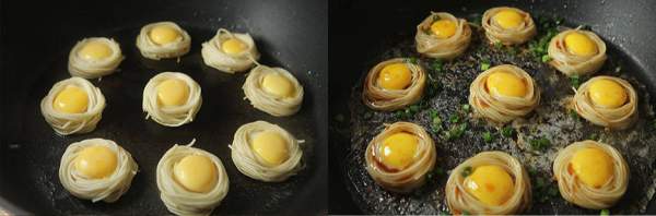 Làm nóng chảo, cho sợi mì vào chảo, dùng đũa cuộn tròn mì xếp thành hình tổ chim, để khoảng trống ở giữa. Chiên ở lửa nhỏ khoảng 1 phút. Cho lòng đỏ trứng cút vào giữa. Thêm hai thìa nước vào chảo, đậy vung và đun trong lửa nhỏ khoảng 2 phút nữa đến khi lòng đỏ trứng se lại. Rắc chút tiêu và hành lá thái nhỏ lên trên để món bánh thơm hơn.