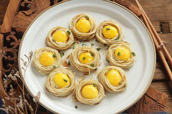Bánh tổ yến là cách gọi vui cho món mì trứng cút. Những sợi mì trứng được làm mềm sau đó cuộn tròn và đặt trứng lên trên giống như tổ chim vậy. Chỉ với vài bước đơn giản, bạn có thể làm được món ăn ngon miệng mà rất đẹp mắt, có thể làm đãi cơm khách thêm hấp dẫn.