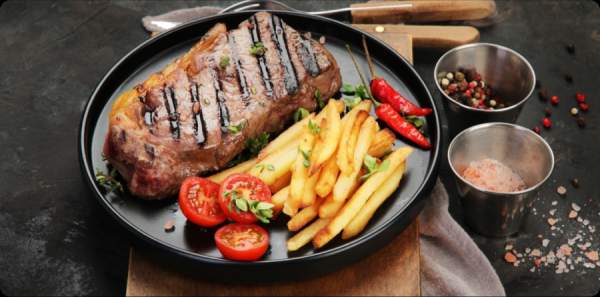 Kèm theo: Khoai tây chiên, salad rau củ, sốt tiêu đen hoặc sốt nấm.
