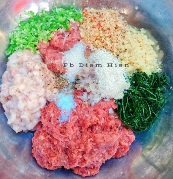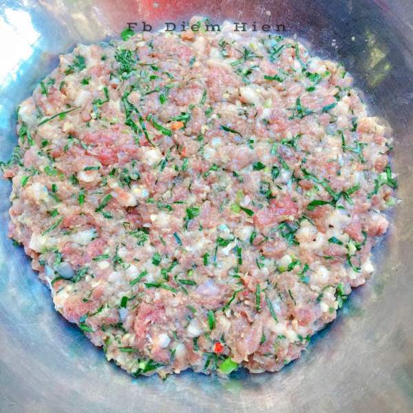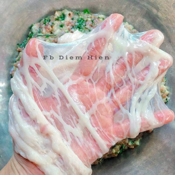 Cho tất cả vào tô lớn(trừ mỡ chài), trộn đều, để 30phút cho thấm gia vị.