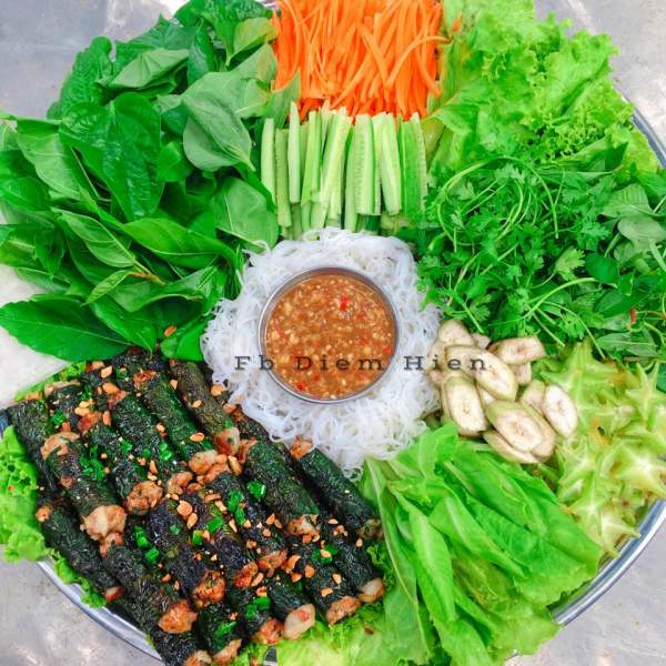 Rau ăn kèm tuỳ thích: xà lách, xá xị, cóc, tía tô, kinh giới, rau thơm, quế, lá lốt, khế, chuối chát, khóm(thơm), dưa leo, cà rốt, bún, bánh tráng.