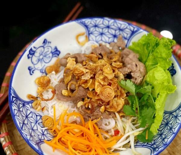 Món bún kết hợp với thịt bò mềm ngọt, rau sống tươi mát, thêm chút nước mắm chua cay mặn ngọt và lạc rang bùi bùi tạo thành một món ăn ngon tuyệt rất hợp với ngày hè oi bức.