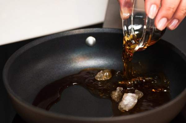 Cho xì dầu, đường phèn, nước và rượu nấu ăn vào chảo đun sôi, khuấy đều tay.