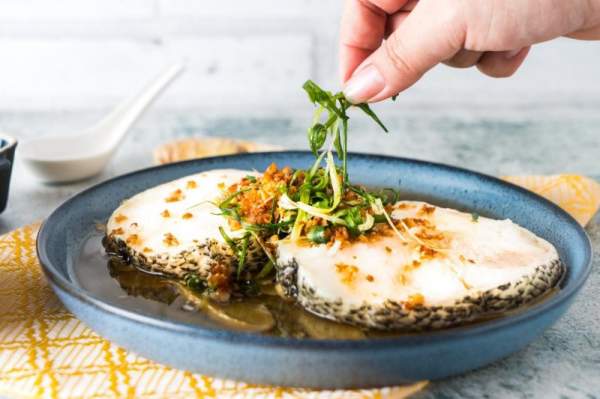Khi cá đã chín, lấy cá ra khỏi nồi hấp và đổ bớt nước trên đĩa. Thêm tiêu và rưới nước sốt cá lên trên. Thêm một ít dầu tỏi và trang trí bằng tỏi phi và hành lá.