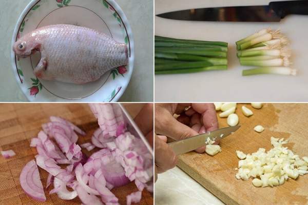 Rửa sạch các nguyên liệu. Tiếp đến, hành lá cắt thành khúc dài. Hành tím và tỏi thì băm nhỏ, còn gừng cắt sợi.