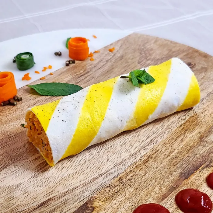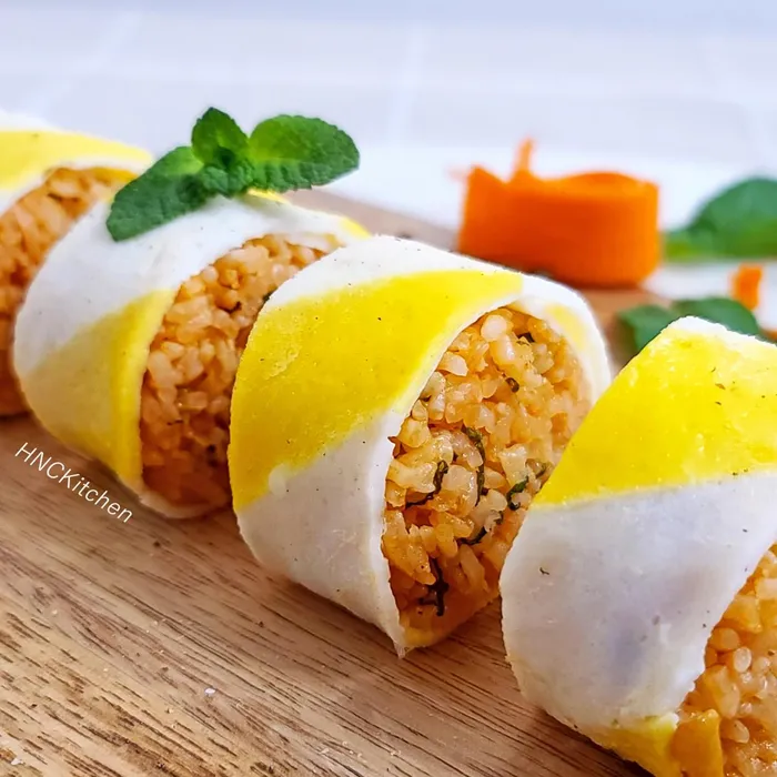 Cho cơm vào trong trứng rồi nhẹ nhàng cuộn chặt lại sau đó trang trí hoặc cắt thành khoanh rồi thưởng thức thôi.