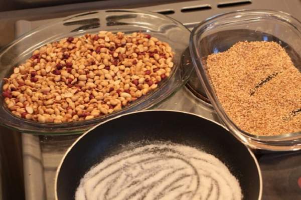 Vừng nhặt sạch, rang thơm, để nguội và giã nhỏ; còn lạc rang chín, bóc vỏ, giã dập. Sau đó, trộn đều lạc, vừng cùng gia vị đường, muối đã giã nhỏ.