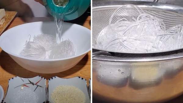 Cho 3 vắt miến tàu vào trong tô, thêm nước sôi vào sao cho ngập mặt rồi đảo đều, đợi 1-2 phút đến khi miến tàu mềm thì vớt ra để ráo nhé! Sau đó, bạn cắt miến thành những đoạn ngắn. Hành lá thì bạn rửa sạch, cắt nhỏ.